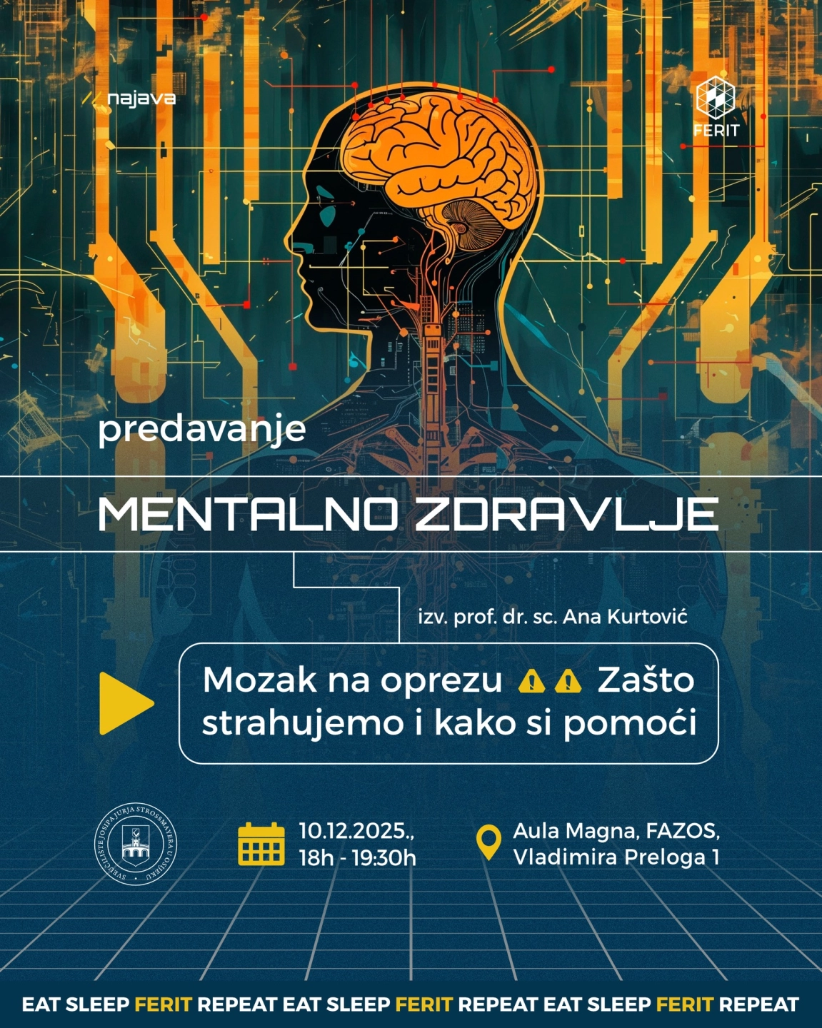 U srijedu, 10.12.2025. godine, od 18h - 19:30h održat će se predavanje Mentalno zdravlje "Mozak na oprezu: Zašto strahujemo i kako si pomoći" na Fakultetu agrobiotehničkih znanosti Osijek, Vladimira Preloga 1, Osijek, u dvorani Aula Magna, 2. kat.
