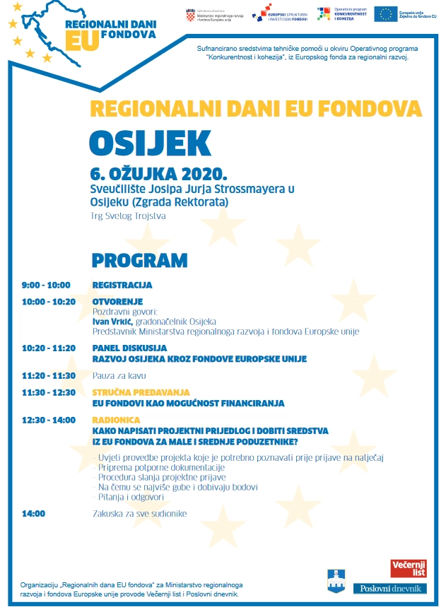 U petak, 6. ožujka 2020. s početkom u 10:00 sati na Sveučilištu Josipa Jurja Strossmayera u Osijeku (Zgrada Rektorata, Trg Svetog Trojstva, Osijek) održat će se besplatne edukacije i stručna radionica pod nazivom "Kako napisati projektni prijedlog i dobiti sredstva iz EU fondova za male i srednje poduzetnike".