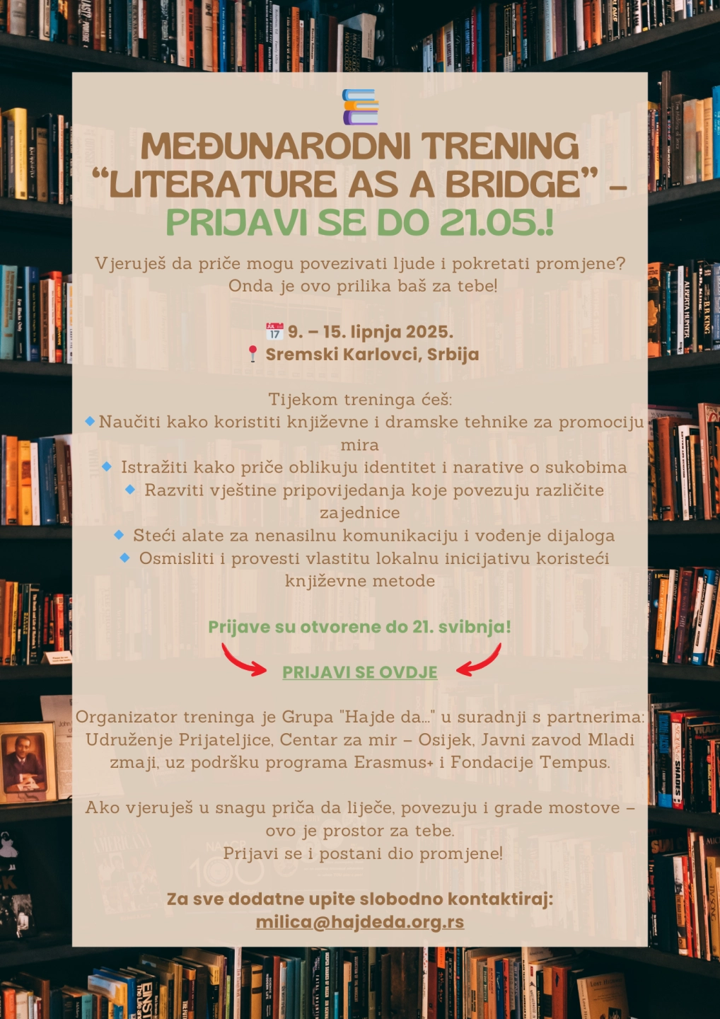 Mladi,  prijavite se na regionalni trening “Literature as a bridge”, koji će se održati od 9. do 15. lipnja 2025. u Sremskim Karlovcima, Srbija.