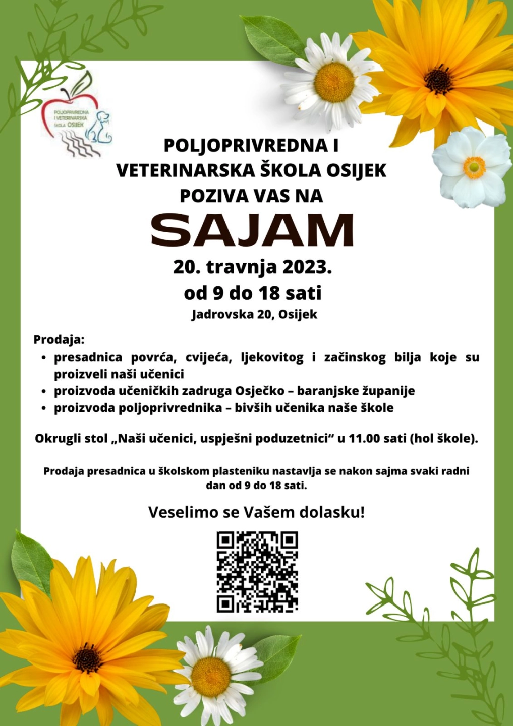 Poljoprivredna i veterinarska škola Osijek poziva vas na sajam koji će se održati u četvrtak, 20. travnja 2023. od 9:00 do 18:00 sati. (Adresa: Poljoprivredna i veterinarska škola Osijek, Jadrovska 20, Osijek). Istog dana u 11:00 sati u holu škole održat će se okrugli stol "Naši učenici, uspješni poduzetnici" za učenike i sve zainteresirane, gdje žele pokazati kako se može uspjeti u životu sa završenom školom, naravno, uz trud i marljiv rad.