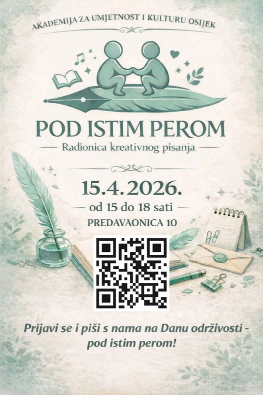 Akademija za umjetnost i kulturu, srdačno poziva studente na sudjelovanje u radionici kreativnog pisanja „Pod istim perom“, jedinstvenom studentskom događaju koji okuplja sudionike različitih studijskih smjerova s ciljem zajedničkog stvaranja, razmjene ideja i razvoja kreativnog izražavanja.